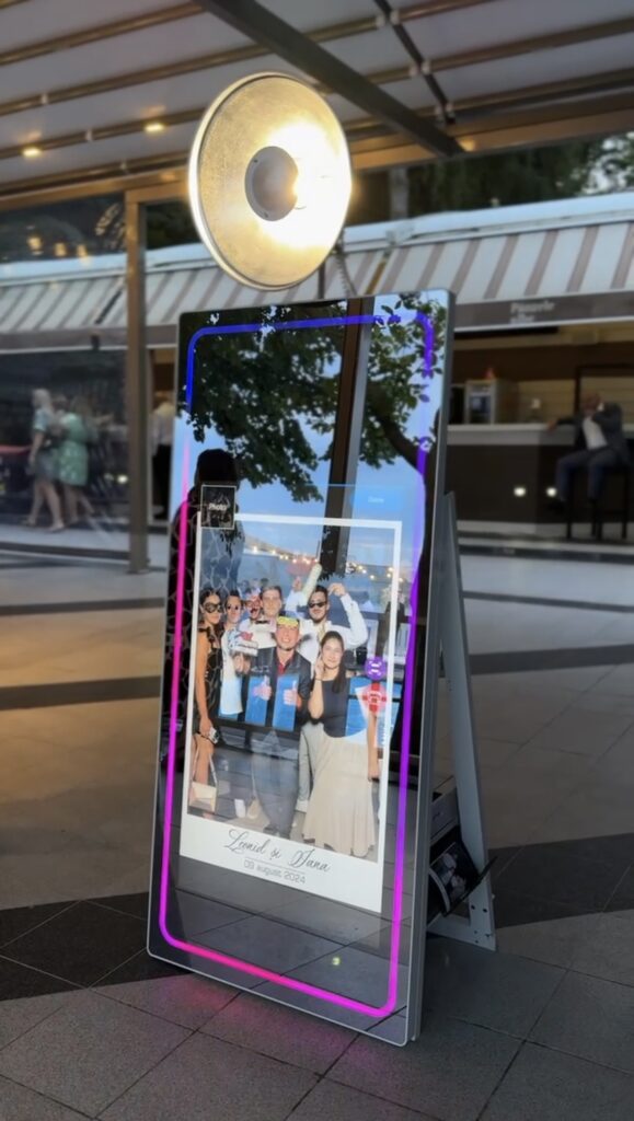 - Dimensiunea ecranului: 11″ vs 43″ Imaginează-ți că ești la nunta ta. Ai așteptat rândul pentru o fotografie și, înainte ca aceasta să fie printată, ai nevoie să vezi cum a ieșit. Verifici dacă toți aveți ochii deschiși, cum îți stă rochia sau părul. Dacă ecranul cabinei foto este de doar 11″, vei avea dificultăți în a vedea aceste detalii, mai ales când stai la o distanță de 2-3 metri. În schimb, Oglinda Magică, cu un ecran de 43″, îți oferă o imagine completă, de sus până jos, a grupului tău, ceea ce îți permite să faci ajustările necesare înainte de a tipări fotografia.
